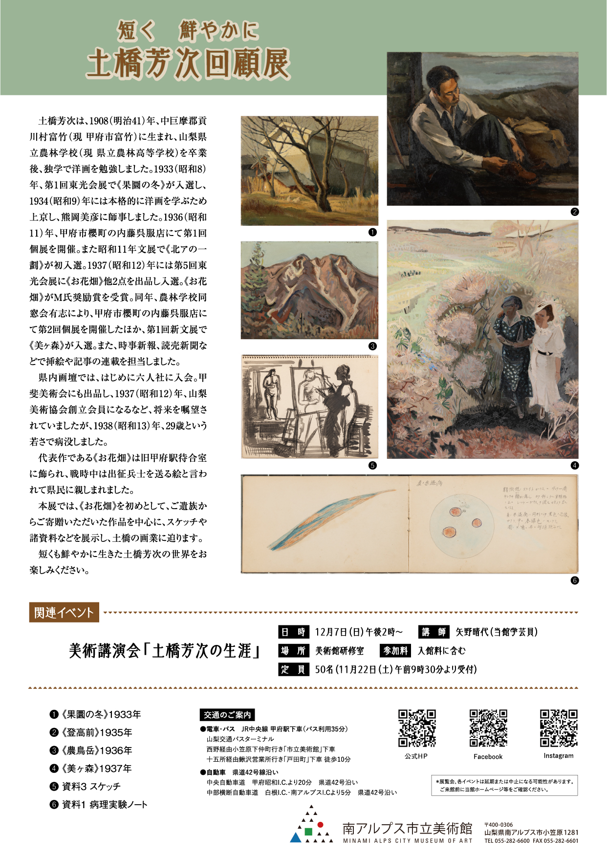 | 関連イベント | 美術講演会「土橋芳次の生涯」 講師 矢野晴代(美術館学芸員) 日時: 12月7日(日)14:00から 料金: 入館料に含む 定員: 50名 |